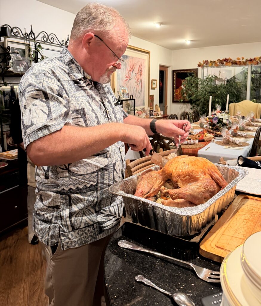 Colonel Jesse stepped right up and did a masterful job of carving the turkey. He had even gotten it out of the oven and onto the counter…all 23 pounds of it!