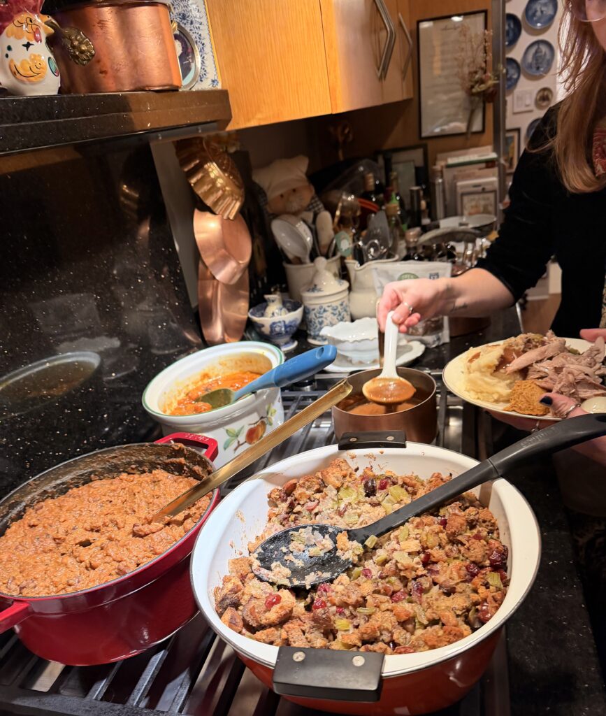 Here’s my stuffing, sweet potatoes, spiced fruit and gravy.