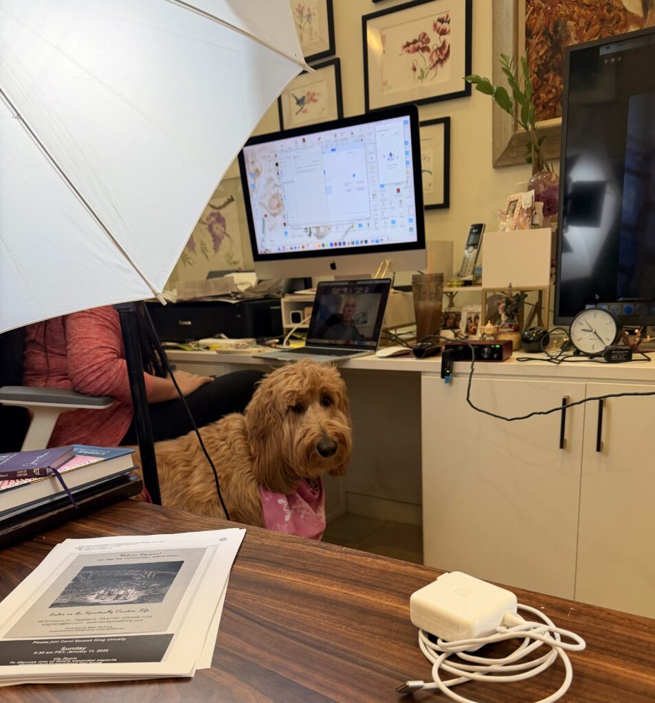 Somi always helps with the tech rehearsal for Carol Soucek King’s “Salon on the Spiritually Creative Life.”