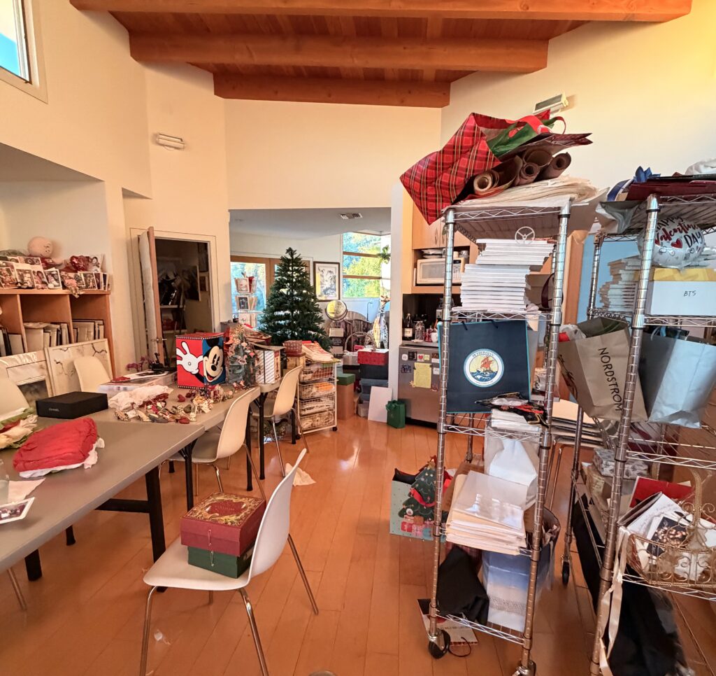 It took Veronica and me two days to pack up all the ornaments on both trees, which I always find very nostalgic, as I remember each and every one. Today Johnny is boxing up the trees and taking some things to the storage facility….the reindeer, Santa’s sled, and some boxes of Christmas stuff. (I probably leave all the Christmas decorations up longer than anyone!)