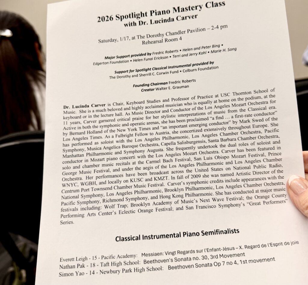 I am thrilled beyond description to support the Music Center’s “Spotlight Program.” Watching a Piano Mastery Class with Dr. Lucinda Carver and the three Classical Instrumental Piano Semifinalists was so inspiring! If you want to have a huge impact on young musicians, Spotlight is the place for you!